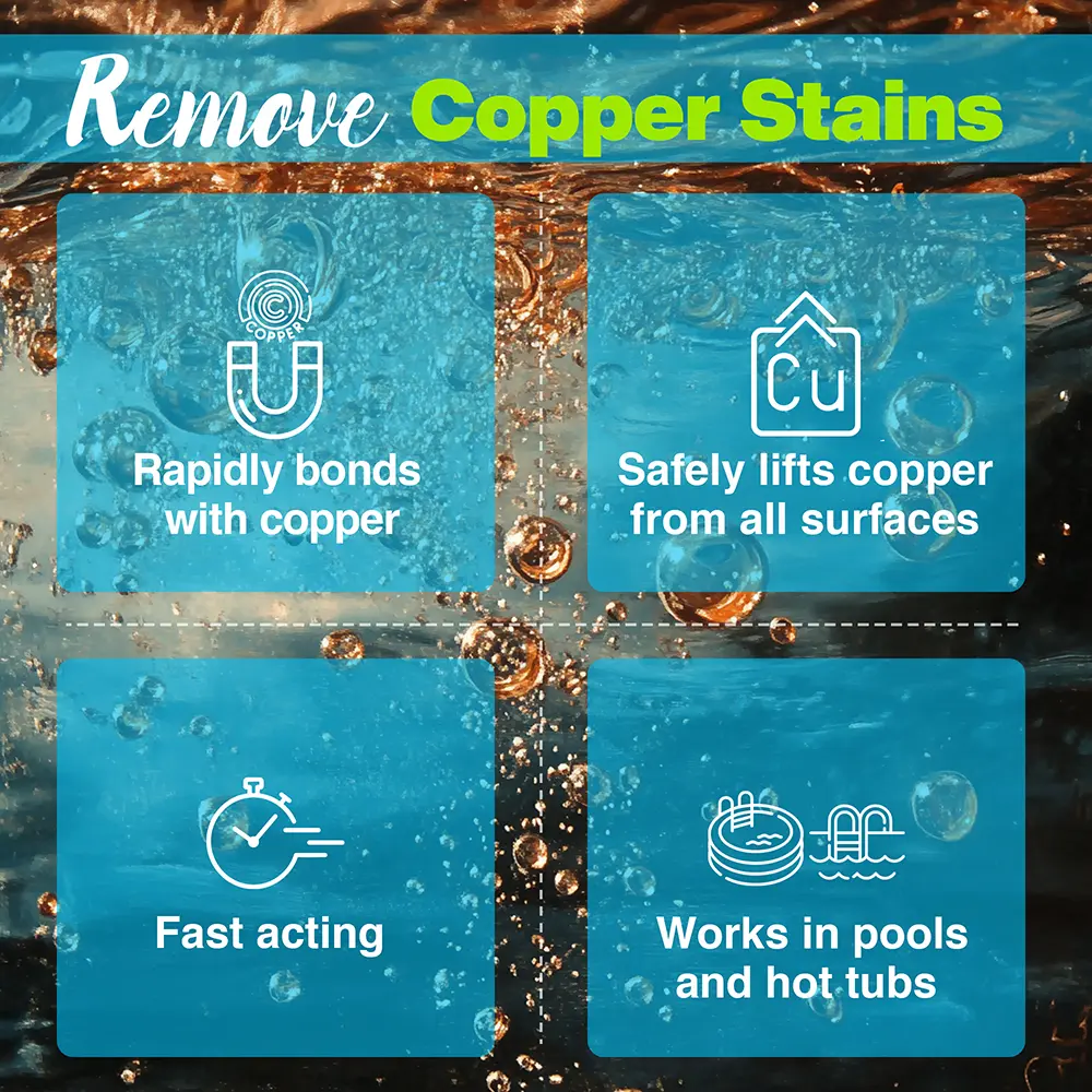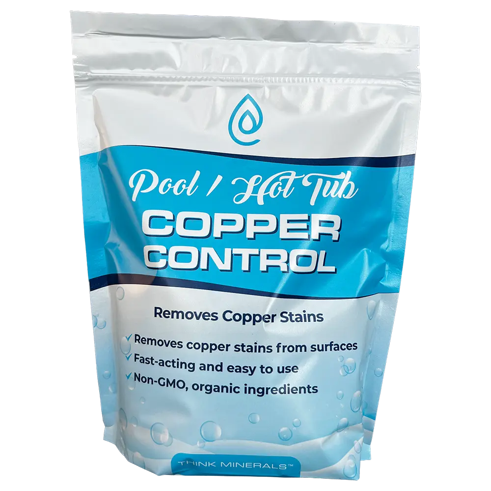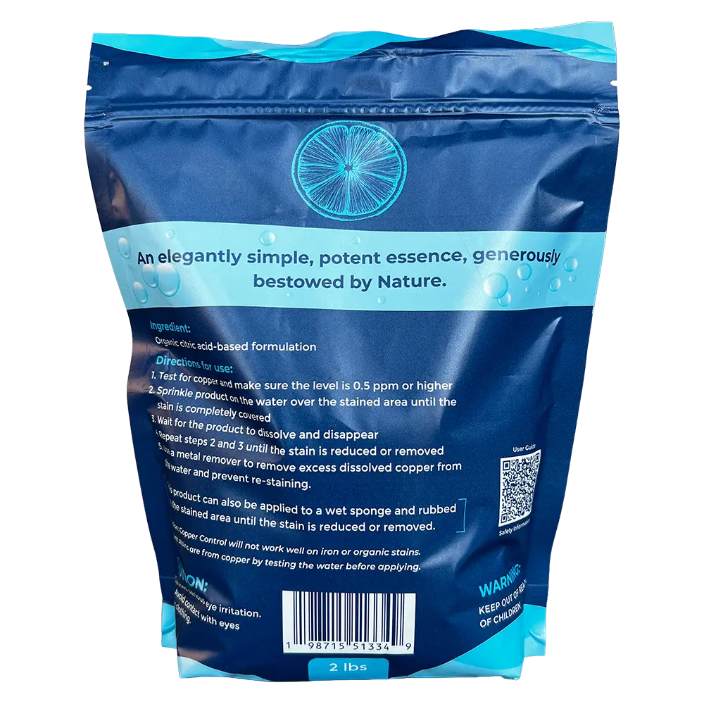 Copper Control uses a natural, organic citric acid and plant-based formulation to remove copper stains on pool and hot tub surfaces without adding harmful chemicals to the water.