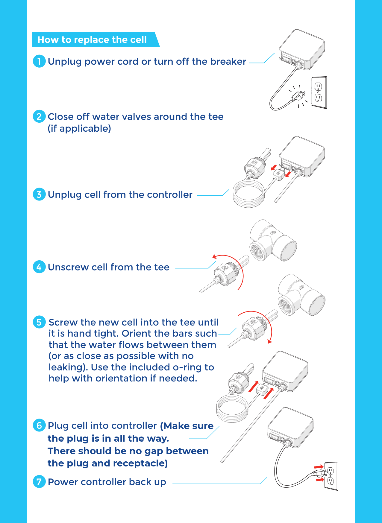 If your controller has a blue number screen, it is time to replace the cell when the ‘Mineral Action’ or ‘Ionizing’ light is flashing red. If your controller has a red number screen, the ‘Ionizing’ light will be off when it’s time to replace the cell.